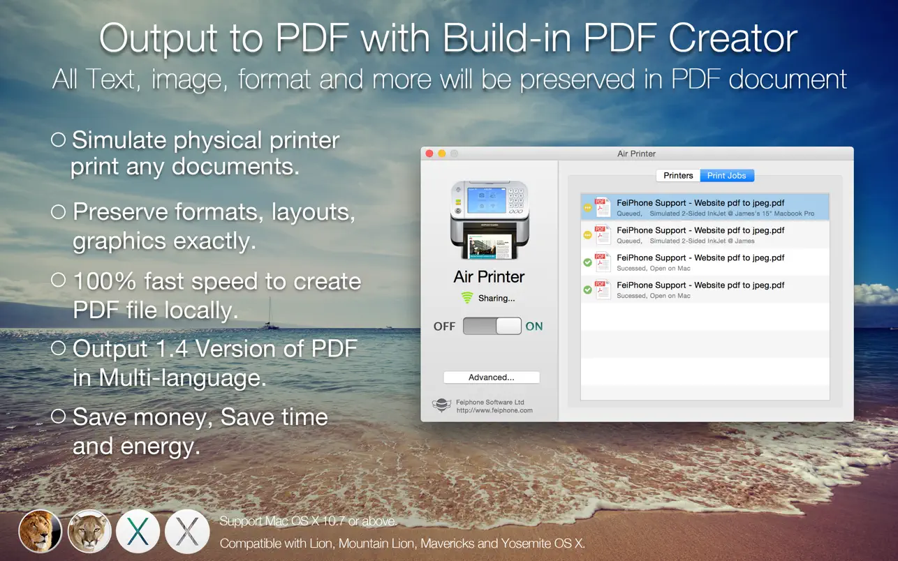 您可以将照片、电子邮件、网页和文档直接无线打印到此虚拟打印机。它创建一个保存到 Mac 磁盘的 PDF 文档,PDF 文件可以在 iBook、PDF Reader 中打开,以获得最佳的阅读体验。此外,您可以通过电子邮件发送 PDF,在其他应用程序中打开,甚至使用 iTunes 文件共享通过 USB 传输到 iPhone 或 iPad。