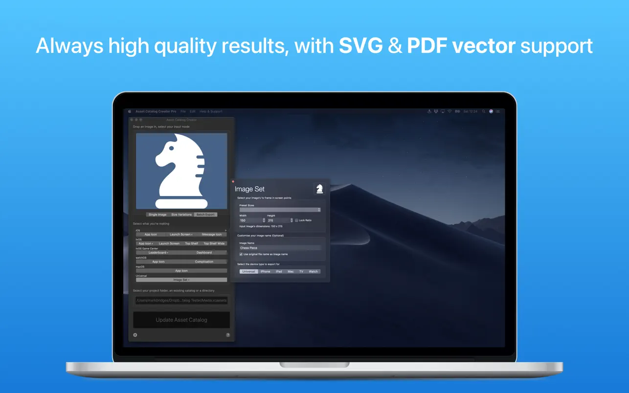 资产目录创建器旨在快速、便捷地使用,并能无缝融入您的工作流程。您只需将图像拖入,指定项目所在位置,选择图标类型并导出即可。该应用程序会找到现有的资产目录,并具有高级合并功能,可根据您的选择进行追加或覆盖。