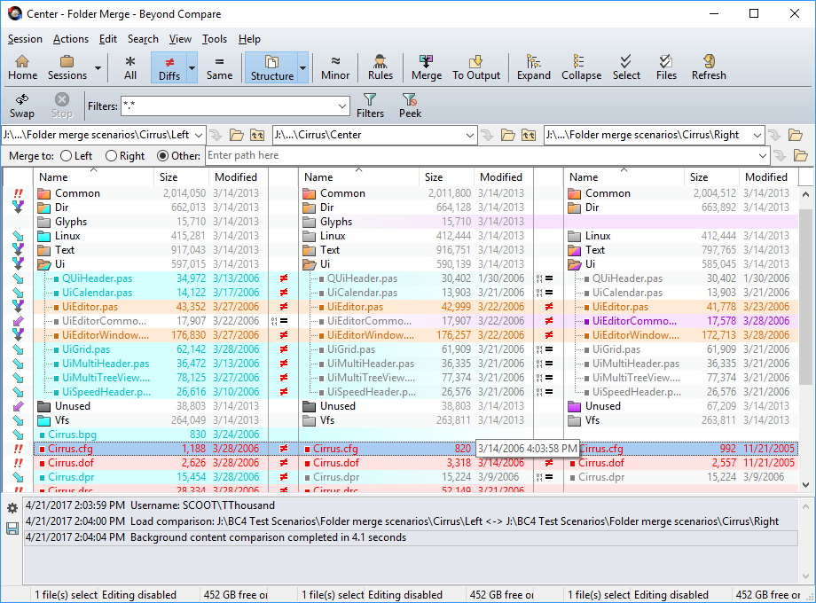Beyond Compare 是一款不可多得的专业级的文件夹和文件对比工具。使用他可以很方便的对比出两个文件夹或者文件的不同之处。并把相差的每一个字节用颜色加以表示,查看方便,并且支持多种规则对比。