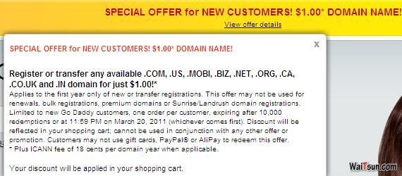 这个很是给力啊收到好域名消息,godaddy推出了特价域名优惠码了,注册或者转移COM, .US, .MOBI, .BIZ, .NET, .ORG, .CA, .CO.UK and .IN等域名仅需1美元,当然了,和以往的特价优惠码一样,仅支持信用卡。