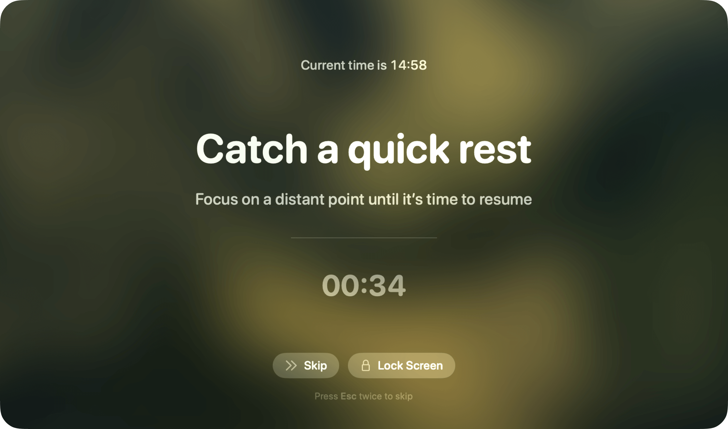 - 休息模式:为了帮助您放松眼睛,LookAway会轻轻地模糊您的Mac屏幕。休息结束时,会播放柔和的铃声。