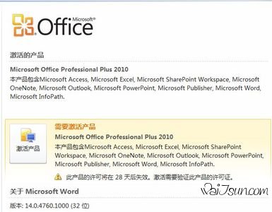 个人认为是出现这种现象的朋友在激活office 2010时同时使用了两个KEY,而其中前一个KEY激活失败(一般是最初泄漏后被封的三个KEY),后一个KEY激活成功,而导致出现这种同时提示激活和未激活的现象!